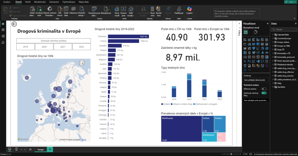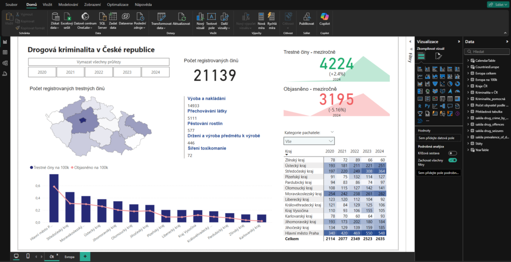 V rámci kurzu datové analytiky zpracovala projekt zaměřený na analýzu dat o drogové kriminalitě v České republice. Cílem bylo zjistit, jak se vyvíjí počet drogových trestných činů v čase, v jakých krajích jsou nejčastější a jaké jsou souvislosti mezi typy drog a konkrétními lokalitami. Pracovala s daty v MySQL a Power BI, kde následně vizualizovala výstupy.