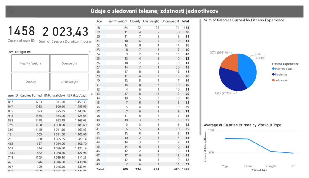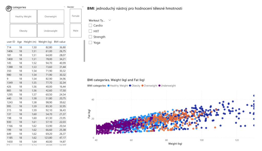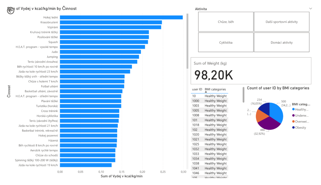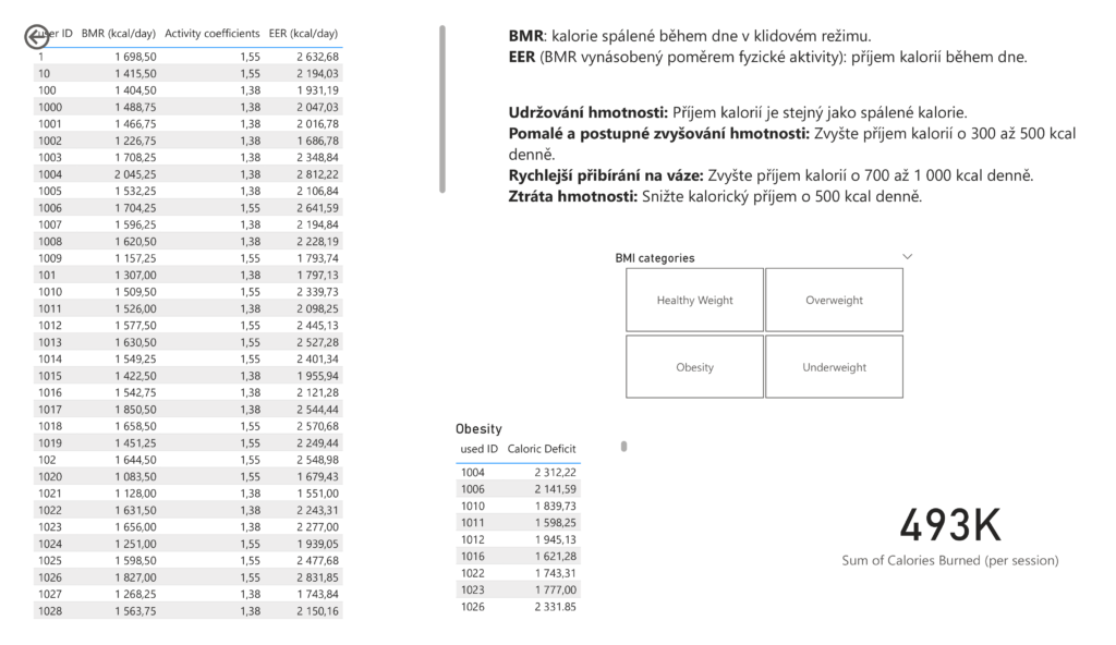 Pro zpracování dat využil nástroj MySQL Workbench, kde si tabulku nahrál a upravil. Poté ji importoval do Power BI, kde ji dále zpracovával pomocí Power Query. Zaměřil se především na data související s BMI a nastavením kalorického deficitu. V projektu vytvořil několik výpočtových vzorců, které mu pomohly získat hodnoty vhodné pro další práci.