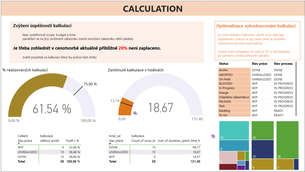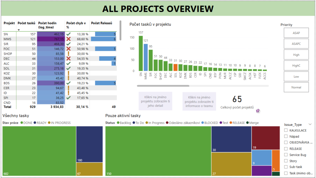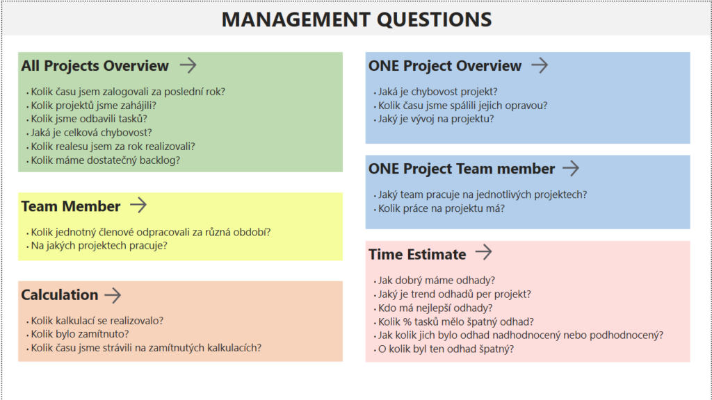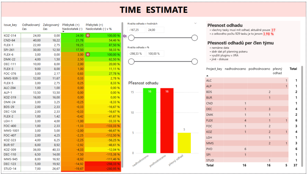 V rámci projektu se rozhodla propojit dvě oblasti, které ji osobně velmi zajímají – datovou analýzu a projektové řízení, konkrétně v prostředí agilního vývoje a nástroje Jira. Cílem bylo zjistit, v jakém stavu se jednotlivé projekty nacházejí, kolik času se věnuje práci na konkrétních úkolech, jak si tým stojí z hlediska nabídnutých odhadů pro zákazníky a zda plánování odpovídá realitě.